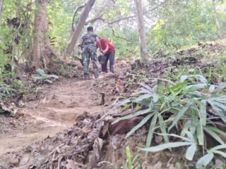 Kendari — Suasana berbeda terlihat di lokasi pembangunan jembatan di Kelurahan Sambuli, Kecamatan Nambo, Kota Kendari, Sabtu (14/2). Seorang ibu paruh baya dengan pakaian biru mencolok tampak penuh semangat membantu personel Satgas TMMD ke-127 dari Kodim 1417/Kendari dalam proses pembangunan jembatan.