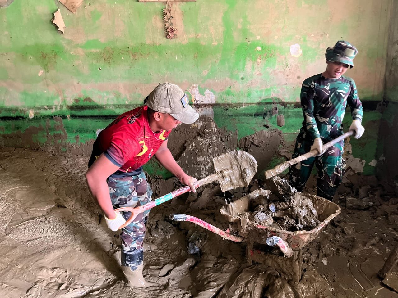 Sejak pagi hari, para prajurit terlihat bahu-membahu bersama warga dan pihak sekolah membersihkan ruang kelas, koridor, halaman sekolah, hingga fasilitas penunjang lainnya. Dengan peralatan seadanya, mereka mengeruk lumpur tebal serta menata kembali sarana pendidikan agar sekolah dapat segera difungsikan kembali.