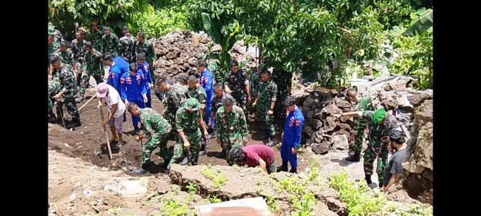 Sebanyak 20 personel Kodim 1310/Bitung ditambah 30 Personel YTP 916/BS dan 10 personel Polairud Polda Sulut dipimpin Pasi Ops Kodim 1310/Bitung, Lettu Inf Edyzon Kasenda, langsung melakukan aksi pembersihan dan evakuasi sisa bangunan dilokasi rumah yang tertimpa gempa.