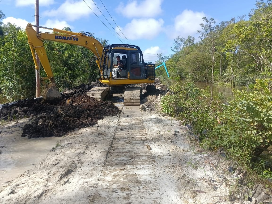 Meski menghadapi kondisi medan yang cukup menantang, Satgas TMMD dengan dukungan alat berat tetap menunjukkan semangat tinggi. Pengurukan tanah menjadi tahap penting agar badan jalan lebih kokoh dan layak untuk dilalui.