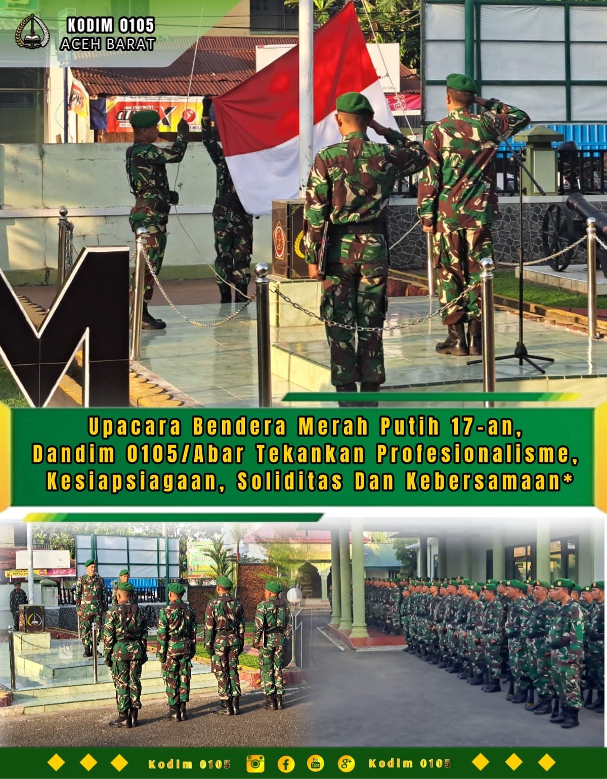“Mari kita senantiasa meningkatkan profesionalisme, baik dalam kemampuan teknis maupun kedisiplinan. Jaga kesiapsiagaan dalam menghadapi segala bentuk ancaman, baik yang bersifat tradisional maupun nontradisional. Perkuat soliditas dan kebersamaan, terutama di internal TNI serta dalam hubungan dengan masyarakat,” tegas Kasdim.