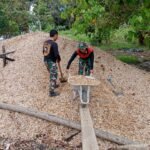 Timika – Suasana ceria terlihat saat anak-anak membantu para anggota Satuan Tugas TNI Manunggal Membangun Desa (TMMD) yang sedang mengangkat kayu untuk pembangunan MCK di Kampung Pigapu, Kab. Mimika. Minggu (18/5/2025)