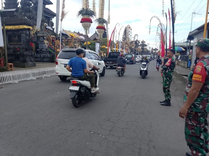 Babinsa Batur Sertu Wayan Suriadnyana menyampaikan bahwa pengamanan ini merupakan bentuk nyata kehadiran TNI dalam mendukung kegiatan keagamaan masyarakat.
