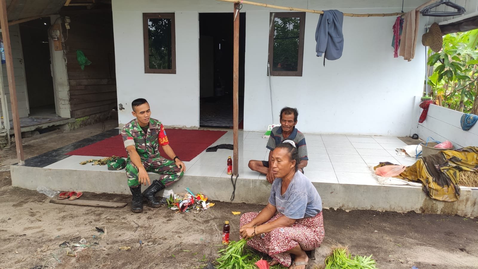 Salah satu kegiatan Komsos yang rutin dilaksanakan terlihat saat Praka Subandi bersama dua rekannya dari Satgas TMMD berdialog santai dengan beberapa warga Kampung Waropko RT 06. Mereka tampak duduk bersama di tanah yang agak becek, dekat lokasi pengerjaan proyek, menunjukkan suasana kehangatan dan kesederhanaan.