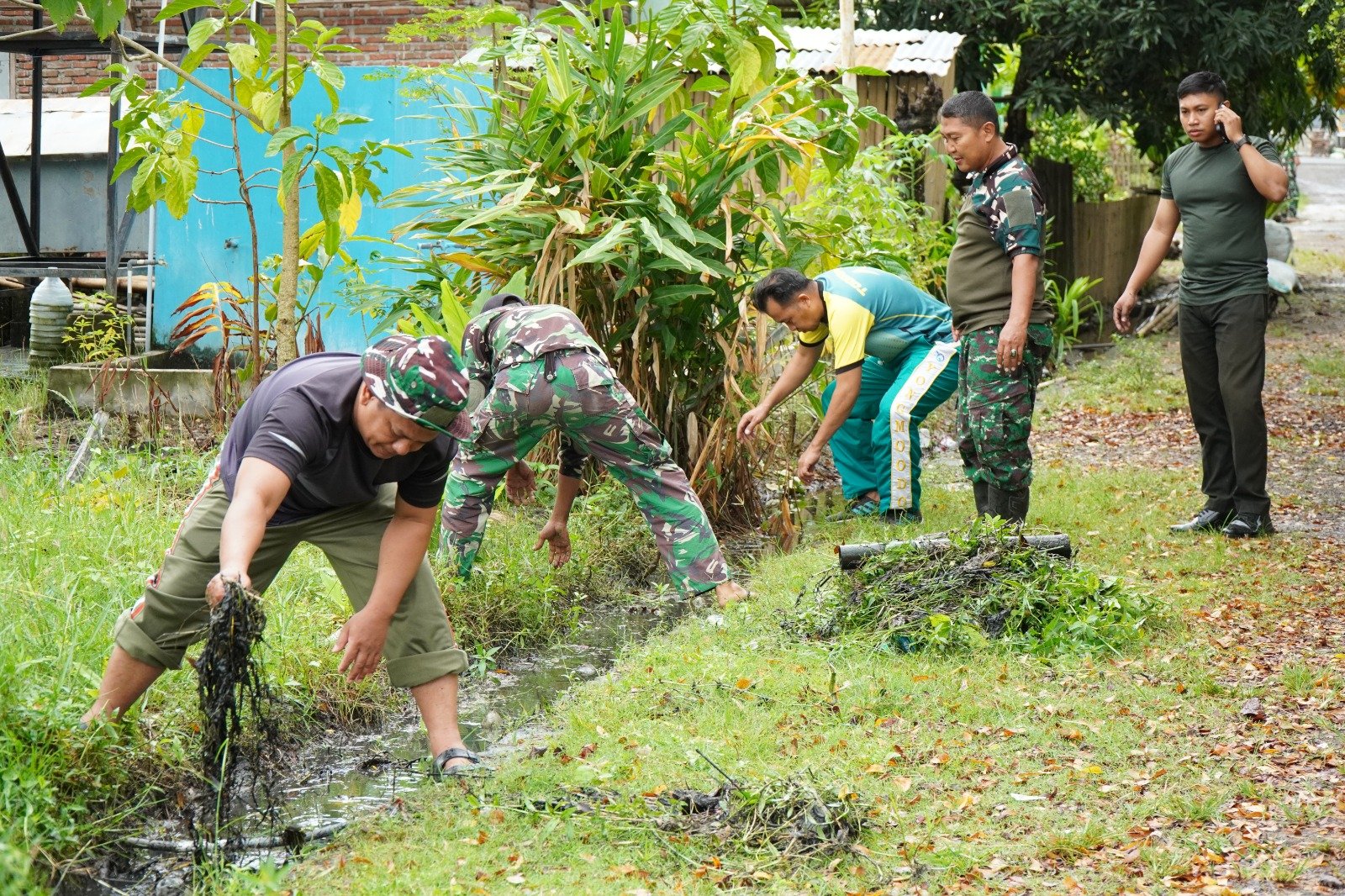 Pelaksanaan karya bakti berjalan dengan penuh semangat kebersamaan. Seluruh personel bahu-membahu membersihkan selokan dengan alat seadanya, menunjukkan dedikasi dalam memelihara sarana umum di lingkungan militer.