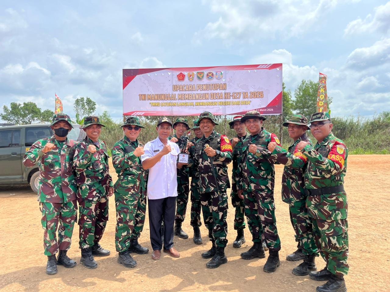 Banyuasin, 11 Maret 2026 – Sebagai bentuk apresiasi atas dukungan dan kebersamaan masyarakat selama pelaksanaan program TNI Manunggal Membangun Desa (TMMD) ke-127, Dansatgas TMMD 127 Kodim 0430/Banyuasin Letkol Inf Handoyo Yudi Prasetyo, S.E., M.H.I., M.Han menyerahkan plakat penghargaan kepada Kepala Desa Wonosari Bapak Usman Novriadi.