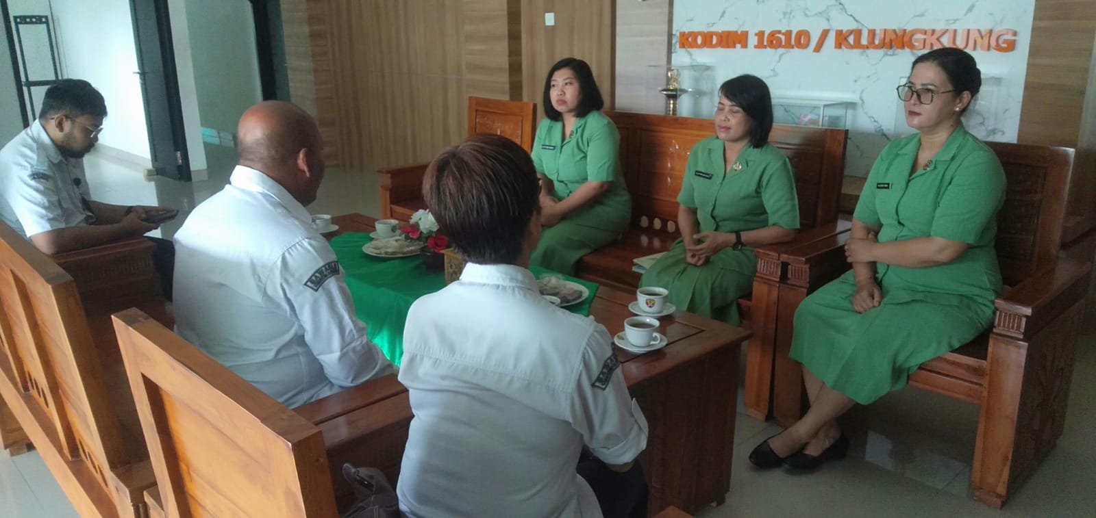 Ketua Seksi Organisasi Persit KCK Kodim Klungkung Ny Putri Suryatha dalam sambutan singkatnya menyampaikan terima kasih dan apresiasi atas kehadiran jajaran Bawaslu Kabupaten Klungkung di Makodim 1610/Klungkung.
