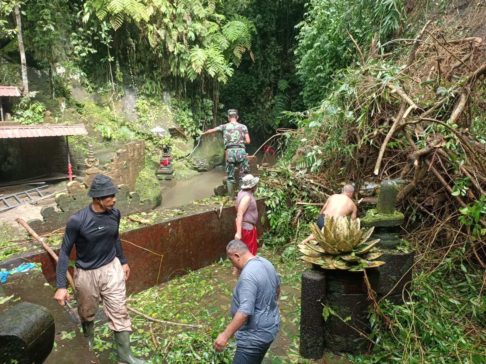 Sertu I Dewa Gede Mertawan menyampaikan bahwa kegiatan ini merupakan bentuk kepedulian Babinsa bersama unsur adat dalam membantu masyarakat serta menjaga tempat suci agar tetap aman. “Kami bersama Pecalang dan warga melaksanakan gotong royong membersihkan material longsor agar tidak membahayakan masyarakat serta aktivitas keagamaan,” ujarnya.