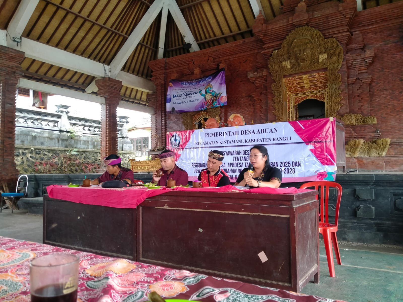 Kegiatan yang dilaksanakan di Balai Desa Abuan ini dihadiri oleh berbagai unsur pemerintahan dan masyarakat. Hadir dalam musyawarah tersebut Pendamping desa Ni Nyoman Ayu Wantari, Kepala Desa I Nyoman Budiarta SE, Babinsa Desa Abuan Serka I Wayan Sukadana, Babinkantibmas desa Abuan Aipda I Nyoman Wirata, Ketua BPD desa Abuan I Nyoman Suardika beserta anggota, Sekdes Desa Abuan Beserta staf desa Abuan, Tokoh masyarakat,tokoh Agama dan Tokoh Adat Desa Abuan, Ketua LPM I Wayan Redana spd dan PLKB desa Abuan Ni Nyoman Mariasih serta Kadus desa Abuan Kadek Purwanta