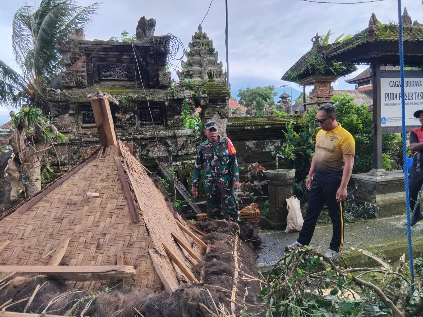 “Saat cabang pohon hampir roboh, tiba-tiba angin datang dan mengubah arah jatuhnya sehingga menimpa bale kulkul Pura Puser Tasik. Akibatnya bangunan bale kulkul roboh,” ujar Babinsa di lokasi kejadian.