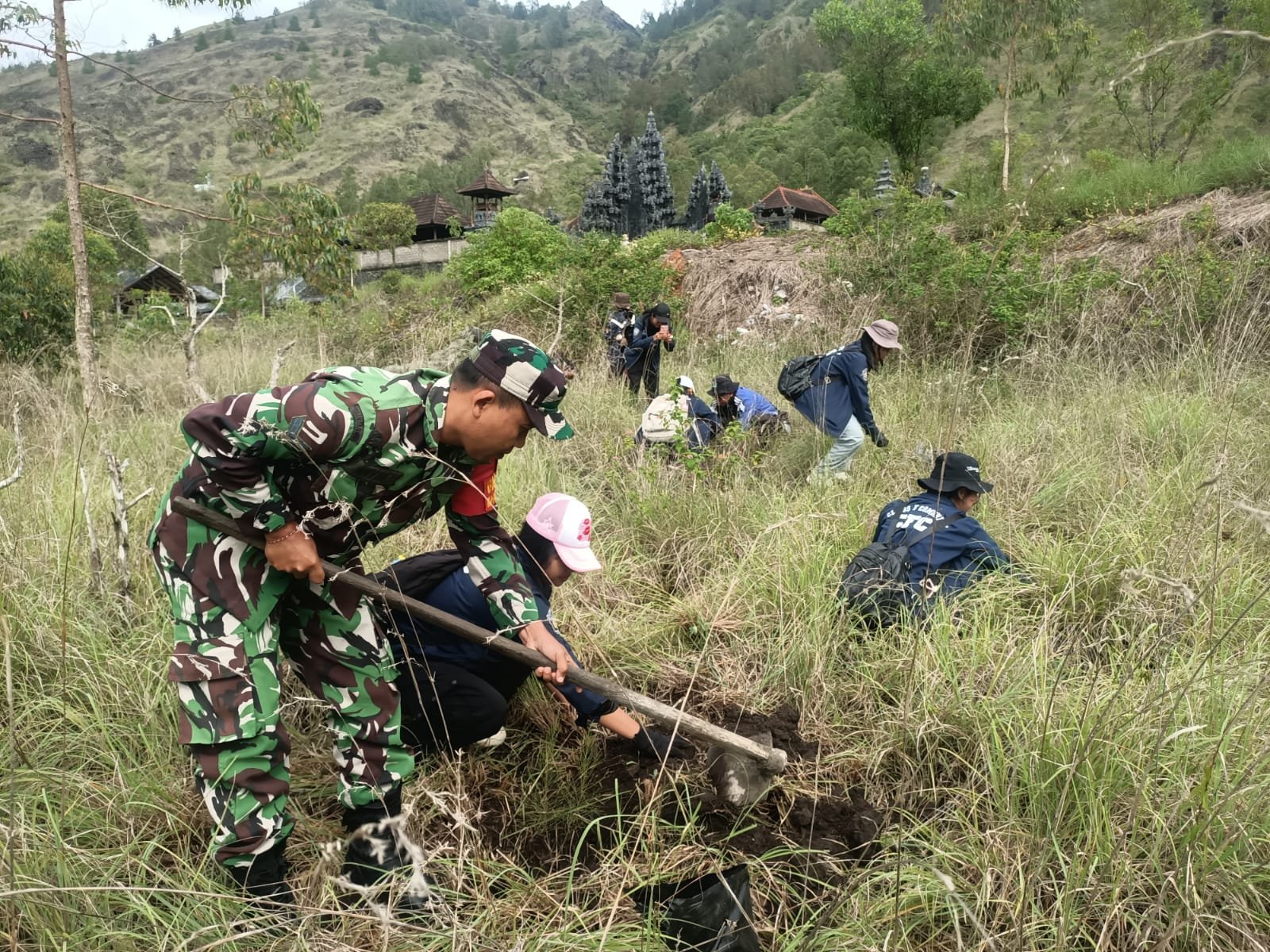 Bangli – Dalam rangka menjaga kelestarian lingkungan dan mendukung upaya pelestarian kawasan konservasi, Babinsa Desa Batur Tengah Koramil 1626-04/Kintamani Sertu Wayan Suriadnyana melaksanakan pendampingan kegiatan karya bakti penanaman pohon di kawasan Pura Pasar Agung, Blok Pasar Agung TWA Gunung Batur, Desa Batur Tengah, Kecamatan Kintamani, Kabupaten Bangli. Selasa (16/12/2025)