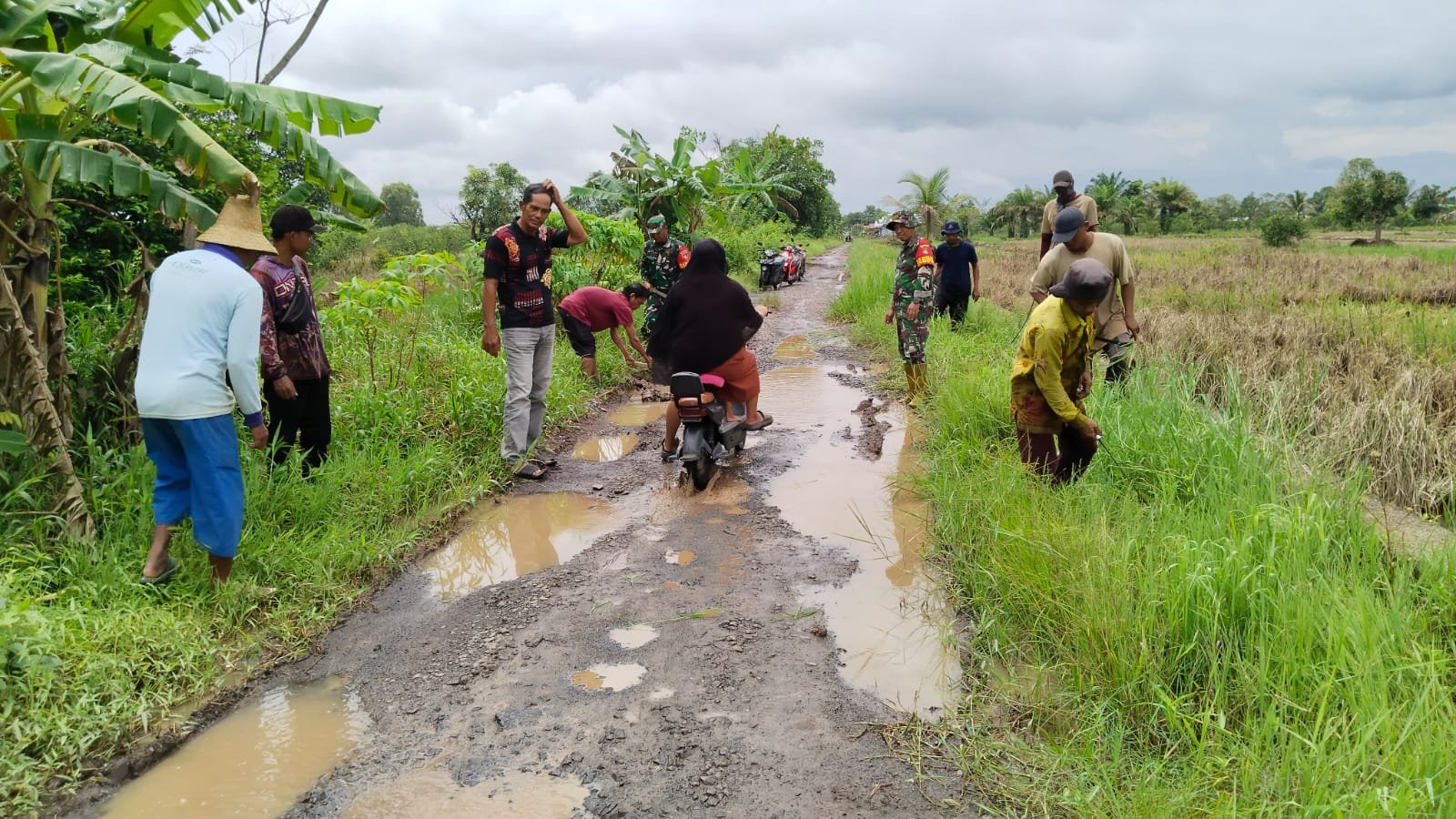Sertu Joni selaku Babinsa setempat tidak hanya hadir sebagai pengawas, tetapi ikut turun tangan bersama warga. Tanah demi tanah ditimbun, sementara sisi kanan dan kiri jalan dibersihkan dari rerumputan agar akses menjadi lebih aman dan nyaman dilalui.