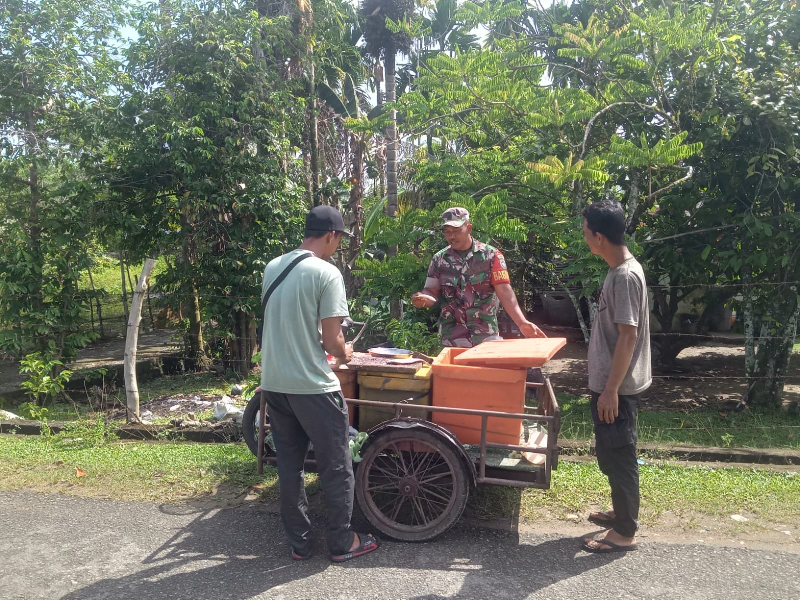 ACEH JAYA – Babinsa Posramil Darul Hikmah Kodim 0114/Aceh Jaya, Sertu M. Hasan, melaksanakan komunikasi sosial (komsos) bersama pedagang ikan keliling di Desa Gampong Baro Patek, Kecamatan Darul Hikmah, Senin (02/03/2026).
