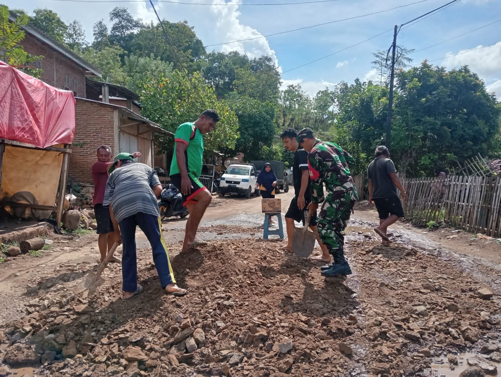 Bima, 10 Mei 2025 – TNI Manunggal bersama rakyat kembali diwujudkan melalui aksi nyata gotong royong. Babinsa Koramil 1608-05/Donggo, Serka Munir, bersama warga Desa Punti, Kecamatan Soromandi, Kabupaten Bima, melaksanakan kegiatan perbaikan jalan rusak yang berada di Dusun Punti. Dalam semangat gotong royong dan kepedulian terhadap infrastruktur desa, melaksanakan perbaikan jalan rusak di Dusun Punti. Jalan tersebut mengalami kerusakan akibat genangan air hujan serta aliran air limbah rumah tangga dari pemukiman dataran tinggi, yang menyebabkan kondisi jalan berlubang dan membahayakan pengguna.
