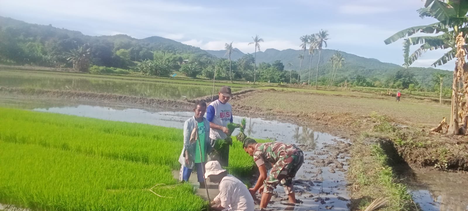 Bukan sekadar memantau, Kopda Tomi tampak membaur bersama warga di tengah hamparan lahan pertanian. Dengan sigap, ia membantu para petani melakukan proses pengikatan bibit, sebuah tahap krusial dalam persiapan masa tanam. Kehadiran personel TNI di tengah sawah ini terbukti menjadi suntikan moral bagi para petani setempat.
