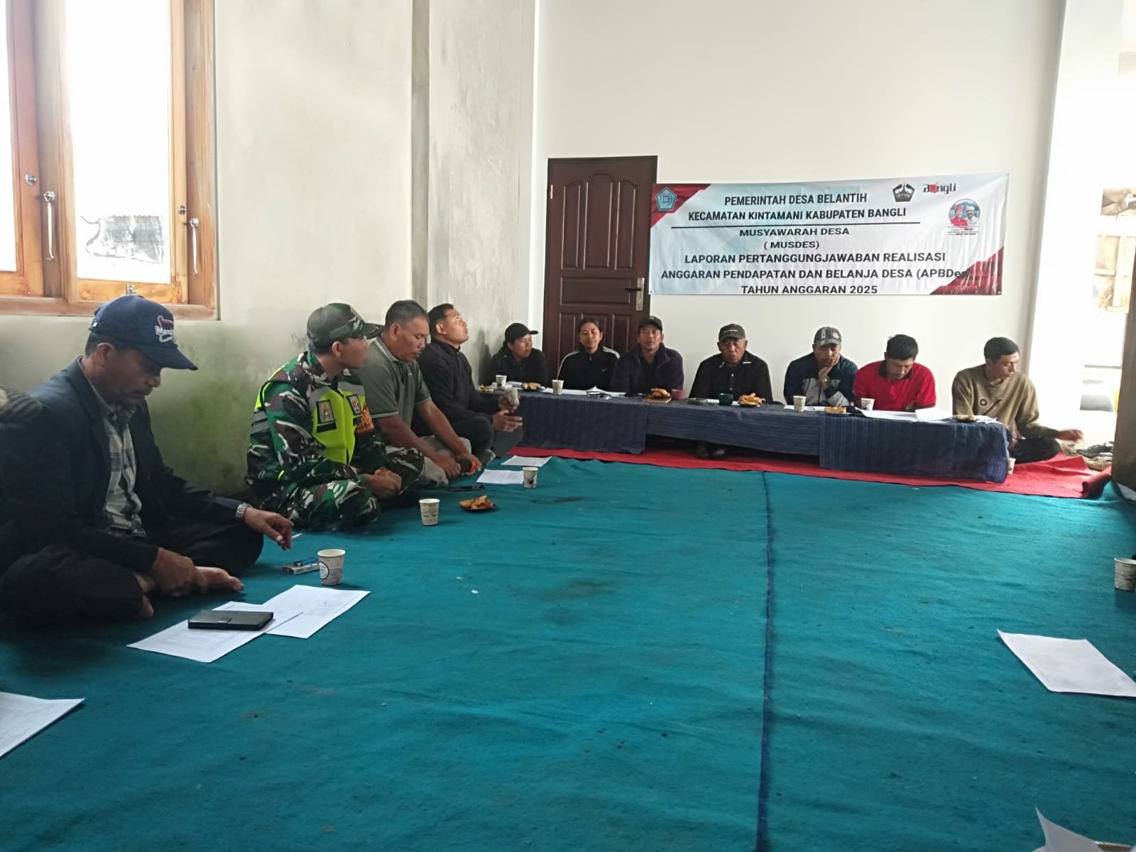 Bangli – Babinsa Desa Belantih Koramil 1626-04/Kintamani Kodim 1626/Bangli, Sertu I Made Sukanadi menghadiri kegiatan Musyawarah Desa (Musdes) dalam rangka Laporan Pertanggungjawaban Realisasi APBDes Tahun Anggaran 2025 yang digelar di Kantor Desa Belantih, Jumat (13/2/2026)