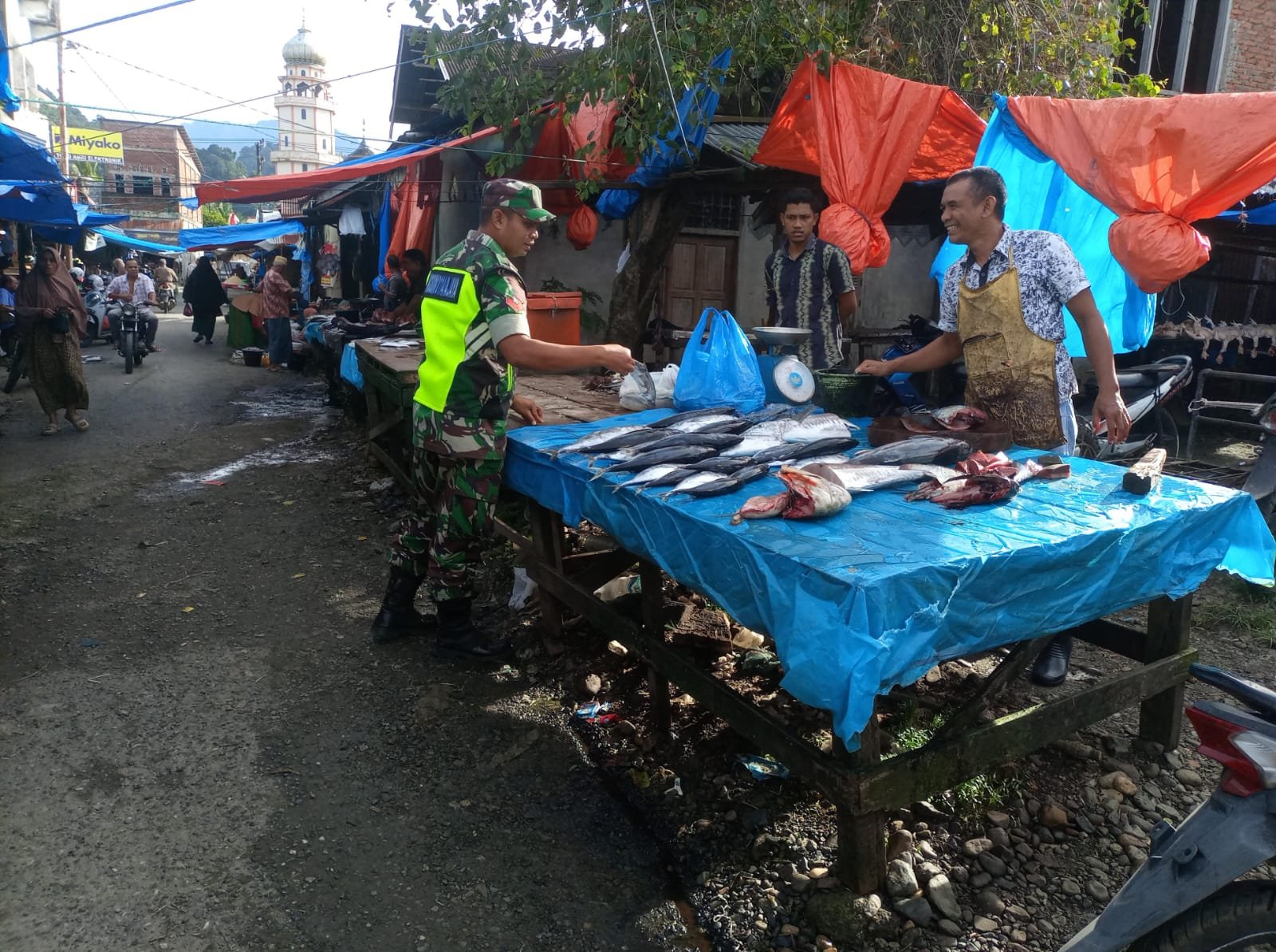 ACEH JAYA – Suasana transaksi jual beli ikan di Desa Pasar Lamno, Kecamatan Jaya, Kabupaten Aceh Jaya, berjalan lancar pada Jumat (06/03/2026). Babinsa Koramil 01/Jaya Kodim 0114/Aceh Jaya, Koptu Aris Kartiko, melakukan komunikasi sosial sekaligus mengecek harga ikan di pasar setempat selama bulan suci Ramadan.