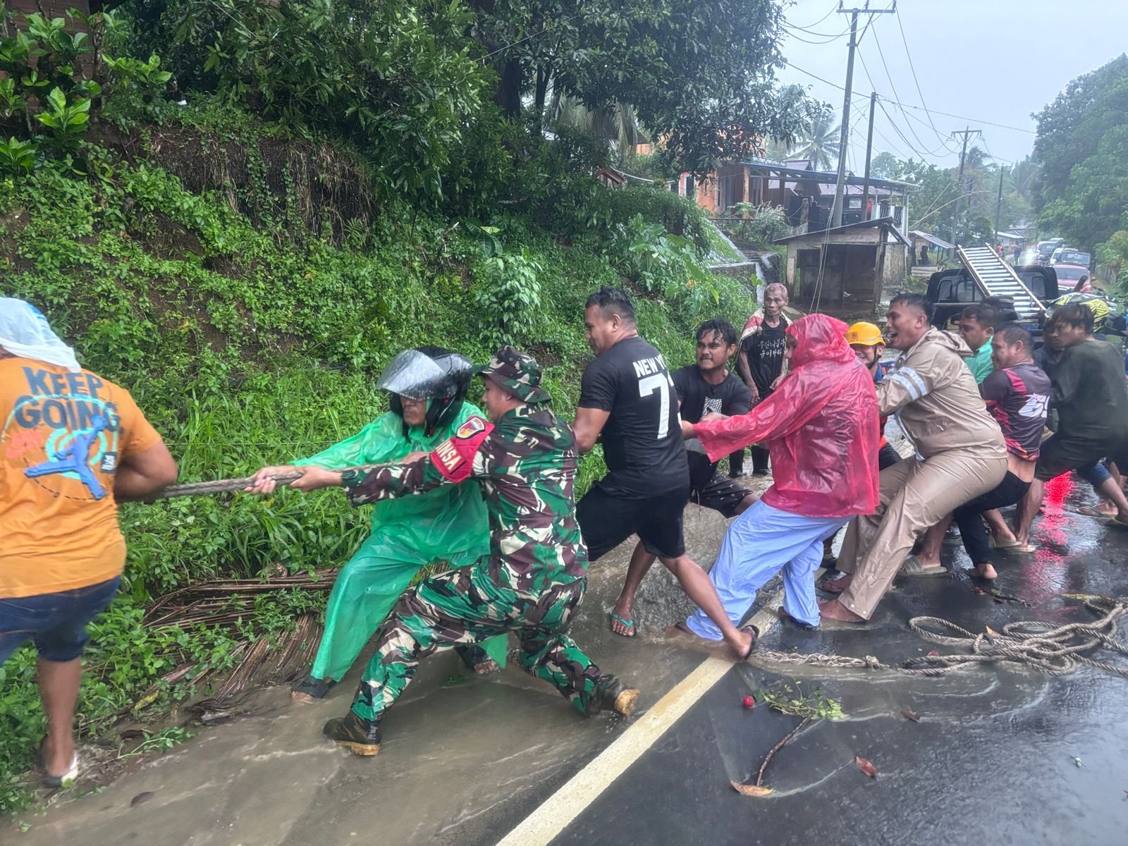 Babinsa bersama aparat desa dan warga setempat bergotong royong melakukan pembersihan dengan memotong dan mengevakuasi pohon kelapa yang tumbang serta menyingkirkan tiang listrik yang roboh ke sisi jalan, guna membuka kembali akses jalan dan menghindari potensi bahaya lanjutan bagi pengguna jalan.