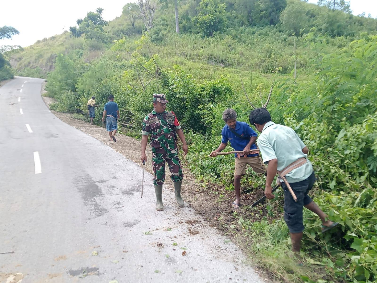 SUMBA BARAT – Babinsa Koramil 02/Walakaka Kodim 1613/Sumba Barat, Serka Ramli, melaksanakan kerja bakti bersama masyarakat membersihkan jalan dari semak belukar yang menghalangi pandangan pengguna jalan di Desa Sodana, Kecamatan Lamboya, Kabupaten Sumba Barat, Selasa (23/12/2025).