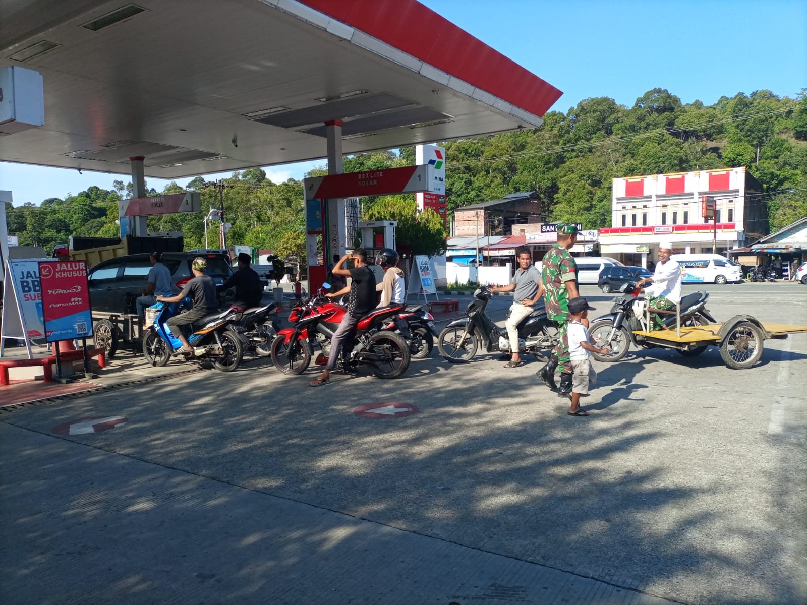 Kehadiran aparat TNI di tengah aktivitas masyarakat juga memberikan rasa aman bagi para konsumen yang sedang mengantre untuk mengisi bahan bakar.