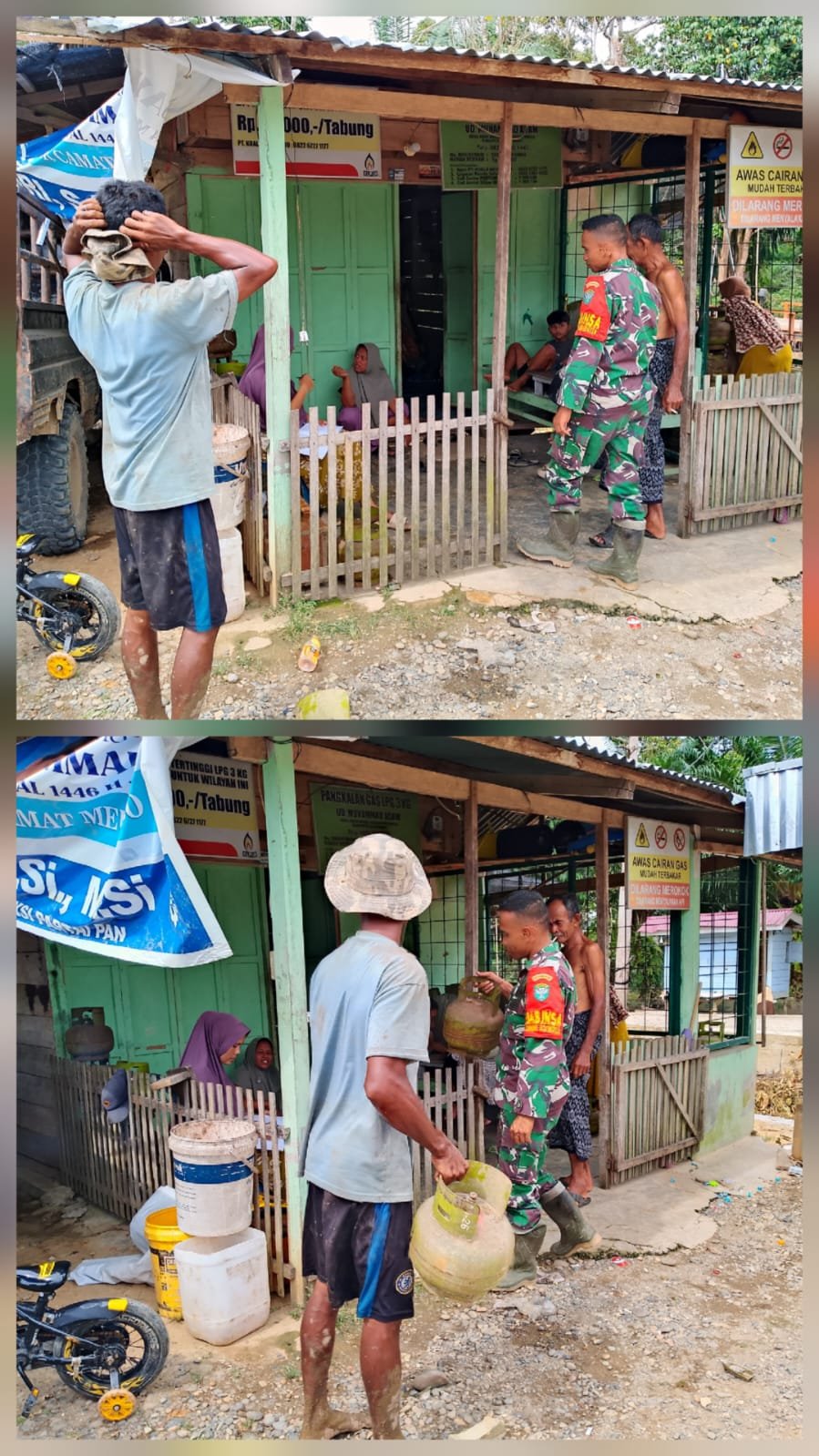 ACEH BARAT — Babinsa Koramil 02/Woyla Kodim 0105/Abar, Serda Didi Suhairi, melaksanakan pengamanan penjualan gas LPG 3 kg guna memenuhi kebutuhan gas elpiji 3 kg masyarakat di Desa Aron Baroh, Kecamatan Woyla, Kabupaten Aceh Barat, Minggu (28/12/2025).