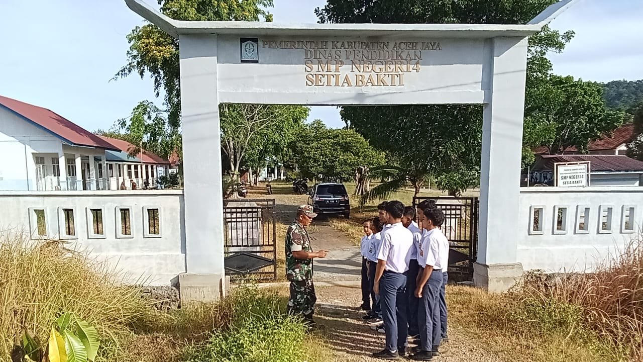 ACEH JAYA – Babinsa Koramil 03/Setia Bakti Kodim 0114/Aceh Jaya, Sertu Marwansyah, melaksanakan kegiatan pembinaan di lingkungan sekolah dengan membantu siswa menyeberang jalan serta memberikan sosialisasi tentang bahaya perundungan di SMP Negeri 4 Setia Bakti, Desa Lhoktimon, Kecamatan Setia Bakti, Selasa (31/3/2026).