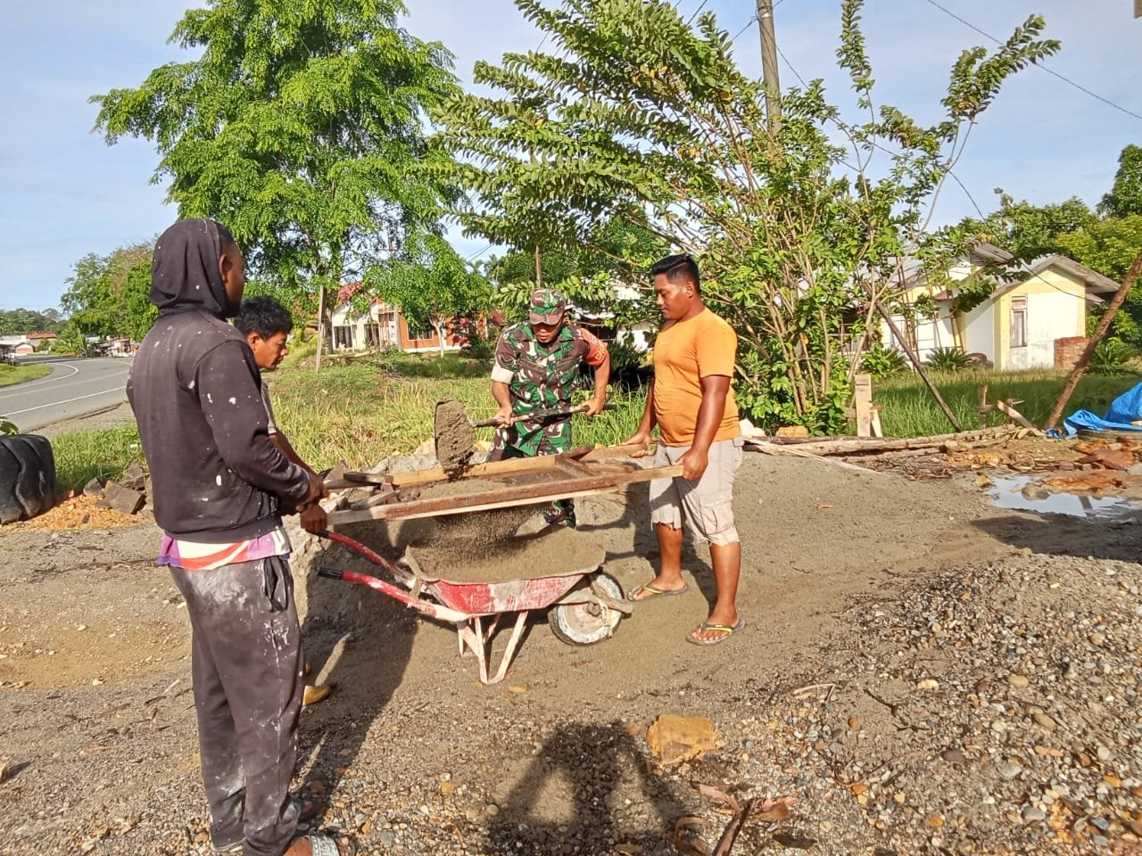 ACEH JAYA – Babinsa Koramil 03/Setia Bakti Kodim 0114/Aceh Jaya, Sertu Marwansyah, melaksanakan kegiatan gotong royong membantu pembangunan rumah milik salah satu warga di Desa Lhok Timon, Kecamatan Setia Bakti, Kabupaten Aceh Jaya, Jumat (03/04/2026).