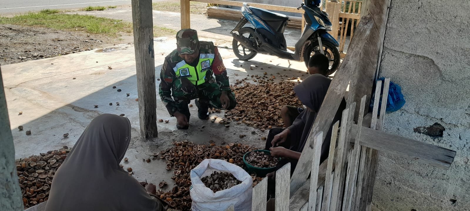 Saat melaksanakan komunikasi sosial, Babinsa menyempatkan diri berbincang dengan masyarakat yang sedang mengupas pinang. Kegiatan tersebut menjadi sarana untuk mempererat hubungan sekaligus mengetahui kondisi perekonomian warga di desa binaan.