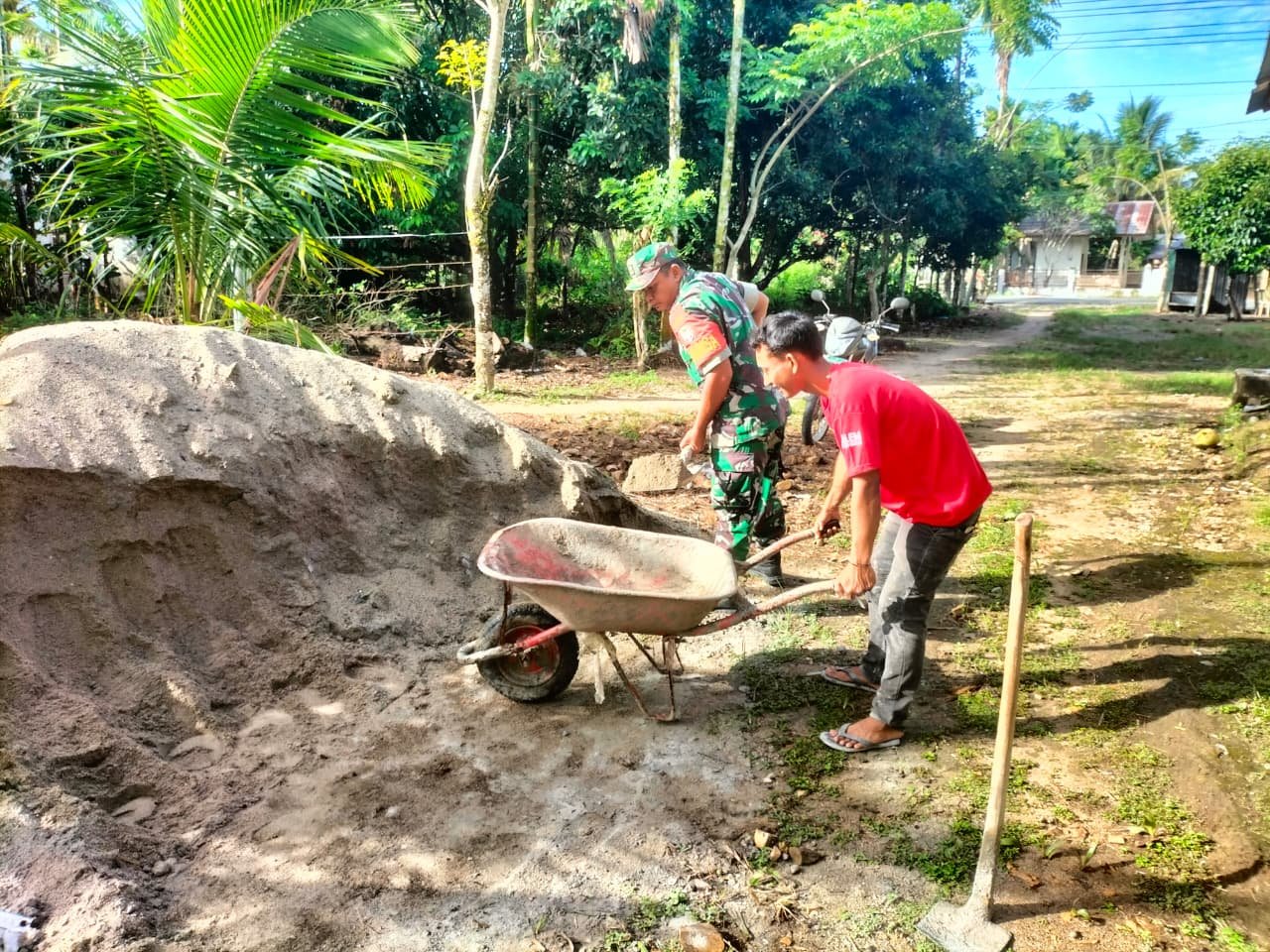 Sejak pagi hari, Babinsa terlihat ikut bekerja bersama warga di lokasi pembangunan rumah. Ia membantu memindahkan dan mengangkut pasir yang akan digunakan sebagai bahan campuran dalam pengecoran lantai rumah.