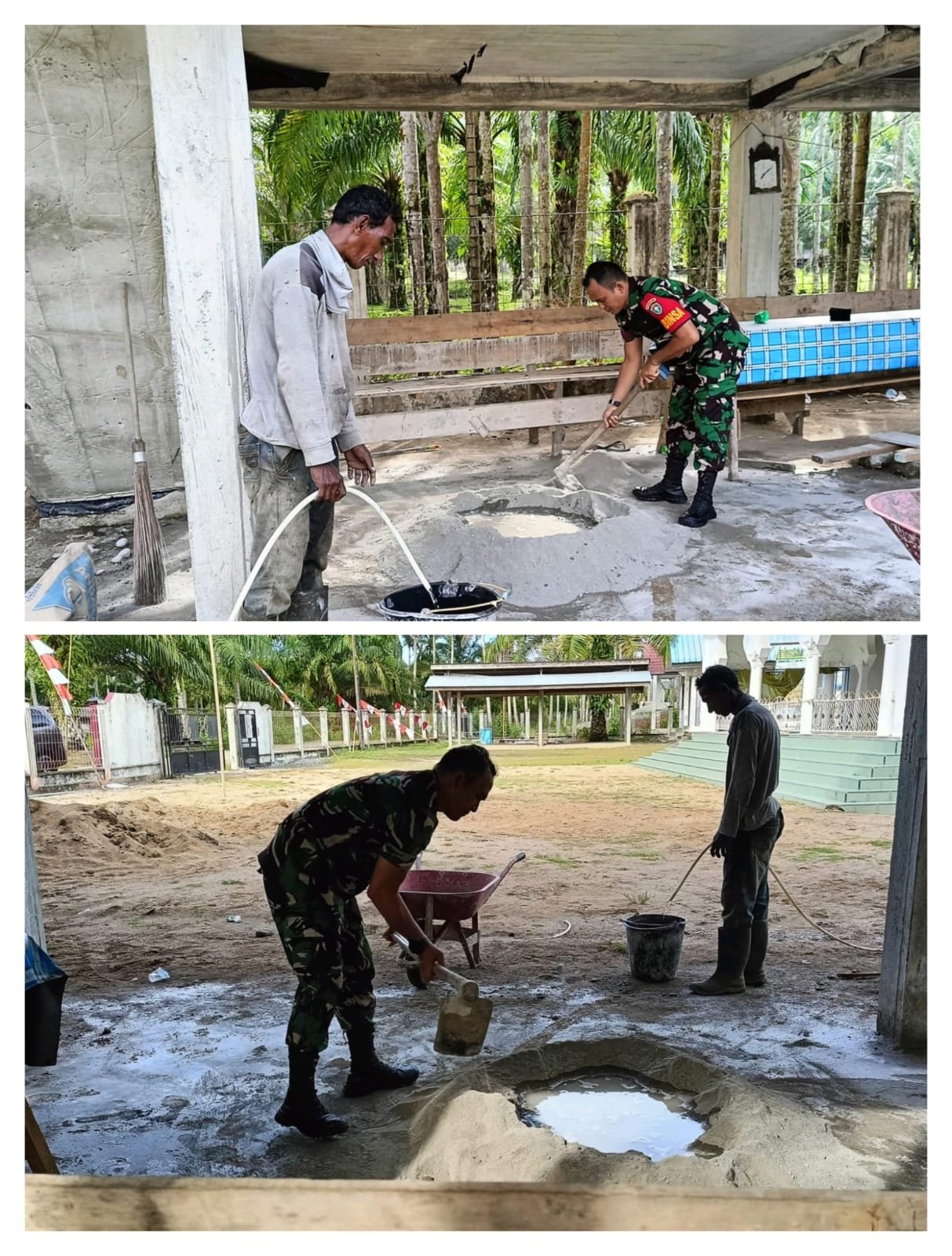 ACEH BARAT – Babinsa Koramil 08/Arongan Lambalek Kodim 0105/Aceh Barat, Koptu Adi Diarto, turut membantu warga mengaduk semen guna mempercepat proses perbaikan area parkir musholla di Desa Simpang Peut, Kecamatan Arongan Lambalek, Kabupaten Aceh Barat, Minggu (01/02/2026).