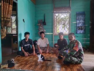 ACEH BARAT – Babinsa Koramil 08/Arongan Lambalek Kodim 0105/Aceh Barat, Koptu Adi Diarto, melaksanakan kegiatan komunikasi sosial (komsos) bersama warga Desa Suak Kemudai, Kecamatan Arongan Lambalek, Kabupaten Aceh Barat, usai menghadiri pesta pernikahan salah satu warga setempat, Rabu (11/02/2026).