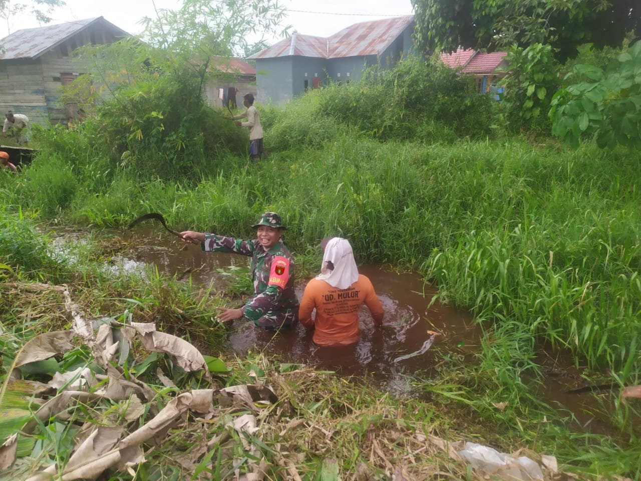 Kotawaringin Timur- Babinsa Koramil 1015-03/Mentawa Baru ketapang Serda Ganda bersama warga melaksanakan gotong royong membersihkan semak belukar dan membersihkan parit di Kelurahan ketapang, Kecamatan Mentawa Baru Ketapang, Kabupaten Kotawaringin Timur, Minggu (30/11/2025)