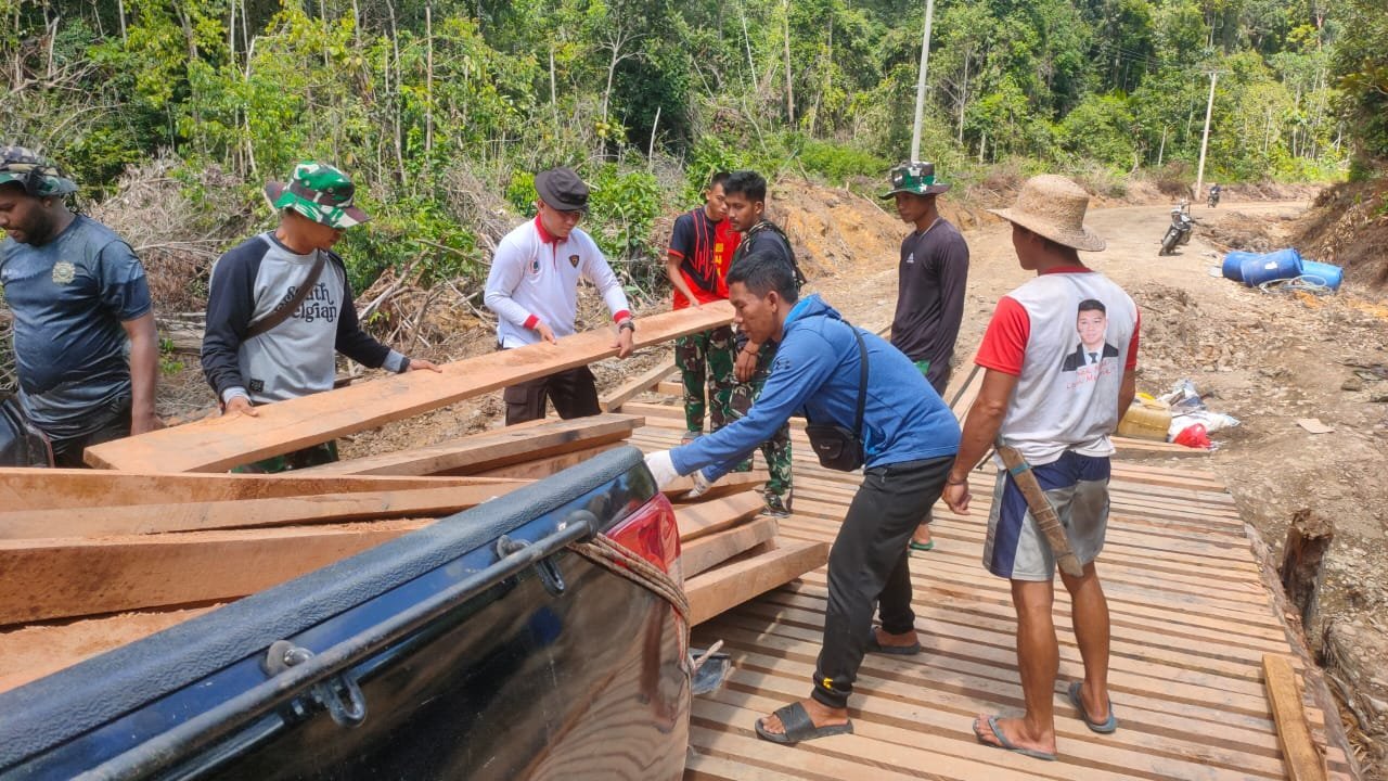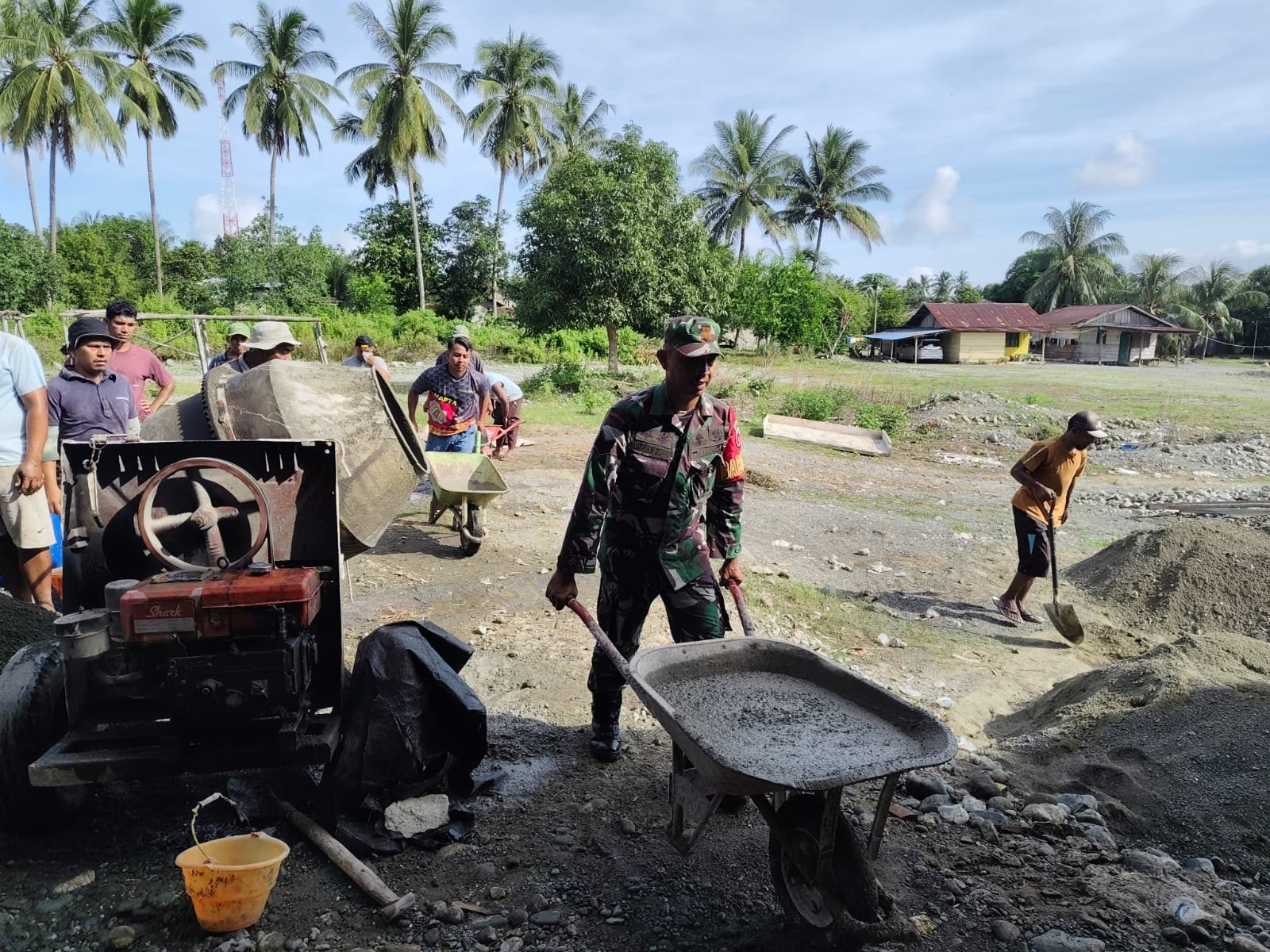 Kotawaringin Timur- Babinsa Koramil 1015-03/Mentawa Baru ketapang Serda Ganda bersama warga melaksanakan gotong royong membersihkan semak belukar dan membersihkan parit di Kelurahan ketapang, Kecamatan Mentawa Baru Ketapang, Kabupaten Kotawaringin Timur, Minggu (30/11/2025)