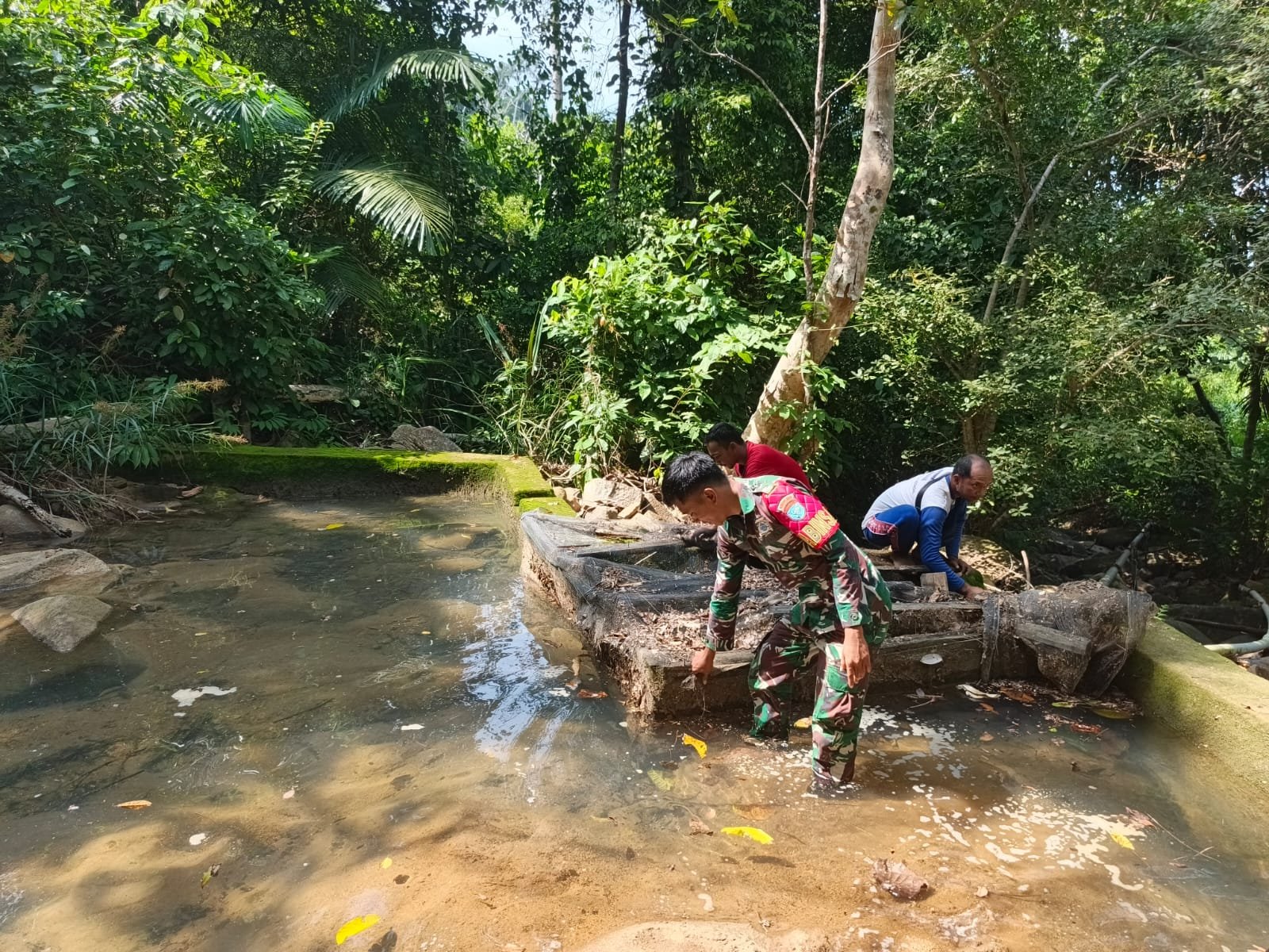 KAYONG UTARA – Dalam rangka menjaga kelestarian lingkungan serta menjamin ketersediaan air bersih bagi masyarakat, Babinsa Koramil 1203-08/Pulau Maya, Serda Hendra Ahmad Yani, bersama Kepala Dusun Mulia Tani, Hasanudin, dan masyarakat setempat melaksanakan kegiatan gotong royong pembersihan bendungan air bersih di Dusun Mulia Tani, Desa Dusun Besar, Kecamatan Pulau Maya, Kabupaten Kayong Utara, Minggu (12/10/2025).