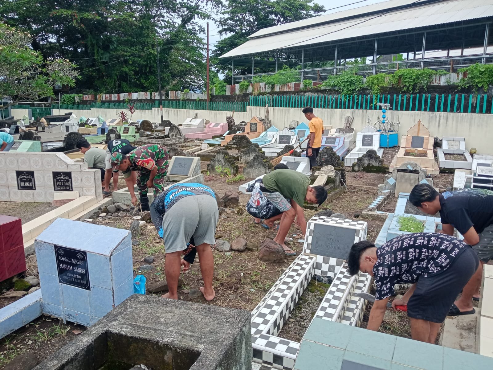 Kegiatan berlangsung dengan penuh semangat dan gotong royong. Masyarakat bersama Babinsa bahu membahu membersihkan area pekuburan dan akses jalan agar lebih rapi dan nyaman, serta memperindah Mushola Umusalma dengan pengecetan dan pemasangan kanopi guna menunjang kenyamanan jamaah dalam beribadah.