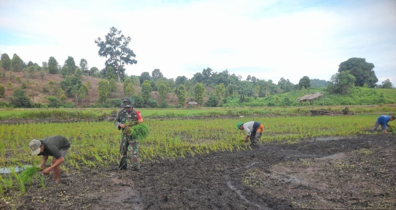 Kolaka Utara – Selasa (20/1/2026). Anggota Koramil 1412-05/Pakue, Serda Imran, turun langsung ke persawahan warga untuk membantu melaksanakan penanaman bibit padi milik masyarakat bina,an.