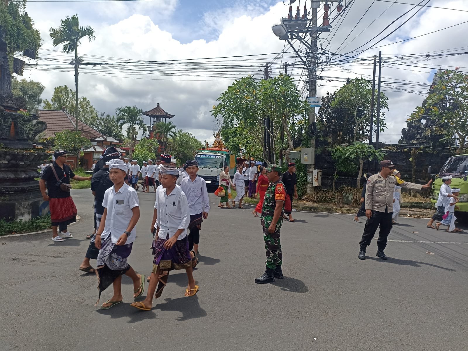 Bangli – Dalam rangka mendukung kelancaran kegiatan adat dan menjaga situasi kamtibmas tetap kondusif, Babinsa Desa Bangbang Pelda Kadek Widiarta bersama Babinsa Desa Peninjoan, Bhabinkamtibmas dan Pecalang melaksanakan pengamanan kegiatan memasar yang merupakan rangkaian upacara Karya Agung Pura Puseh lan Pura Baleagung Desa Adat Pulesari, bertempat di Areal Pasar Desa Bangbang, Kecamatan Tembuku, Kabupaten Bangli, Rabu sore (7/1/2026).