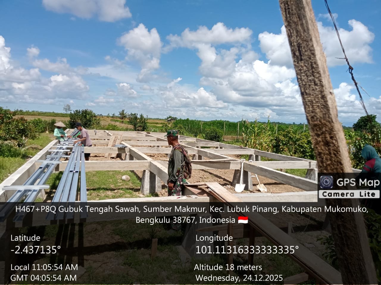 Mukomuko – Babinsa Koramil 428-01/Mukomuko Serda Detot Alpian melaksanakan pengawasan pembuatan tempat toren penampungan air sumur bor dan kandang kambing di lokasi Green House Desa Sumber Makmur, Kecamatan Lubuk Pinang, Kabupaten Mukomuko, pada Rabu, 24 Desember 2025, mulai pukul 09.00 WIB hingga selesai.
