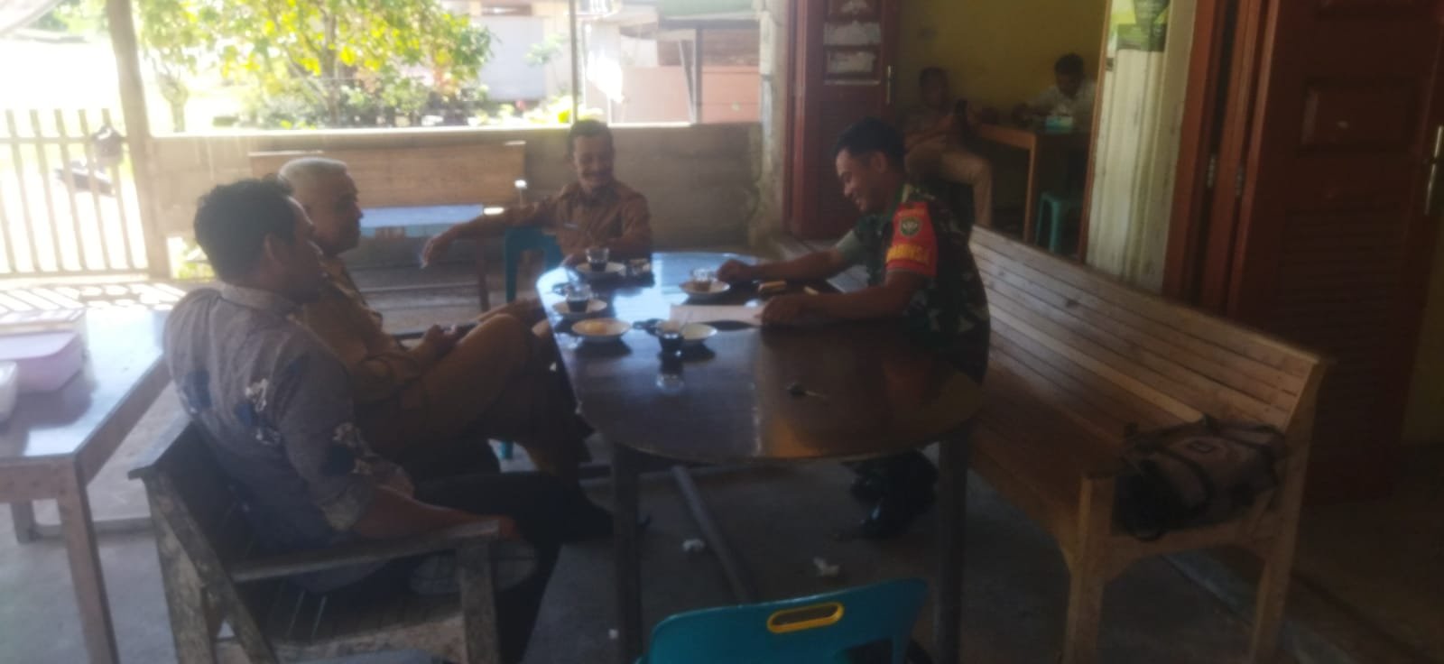 ACEH JAYA — Babinsa Koramil 03/Setia Bakti jajaran Kodim 0114/Aceh Jaya, Serda Zainal Aripin, melaksanakan kegiatan Komunikasi Sosial (Komsos) bersama Kepala Desa di salah satu warung kopi Desa Lhok Gluempang, Kecamatan Setia Bakti, Kabupaten Aceh Jaya, Selasa (23/12/2025).