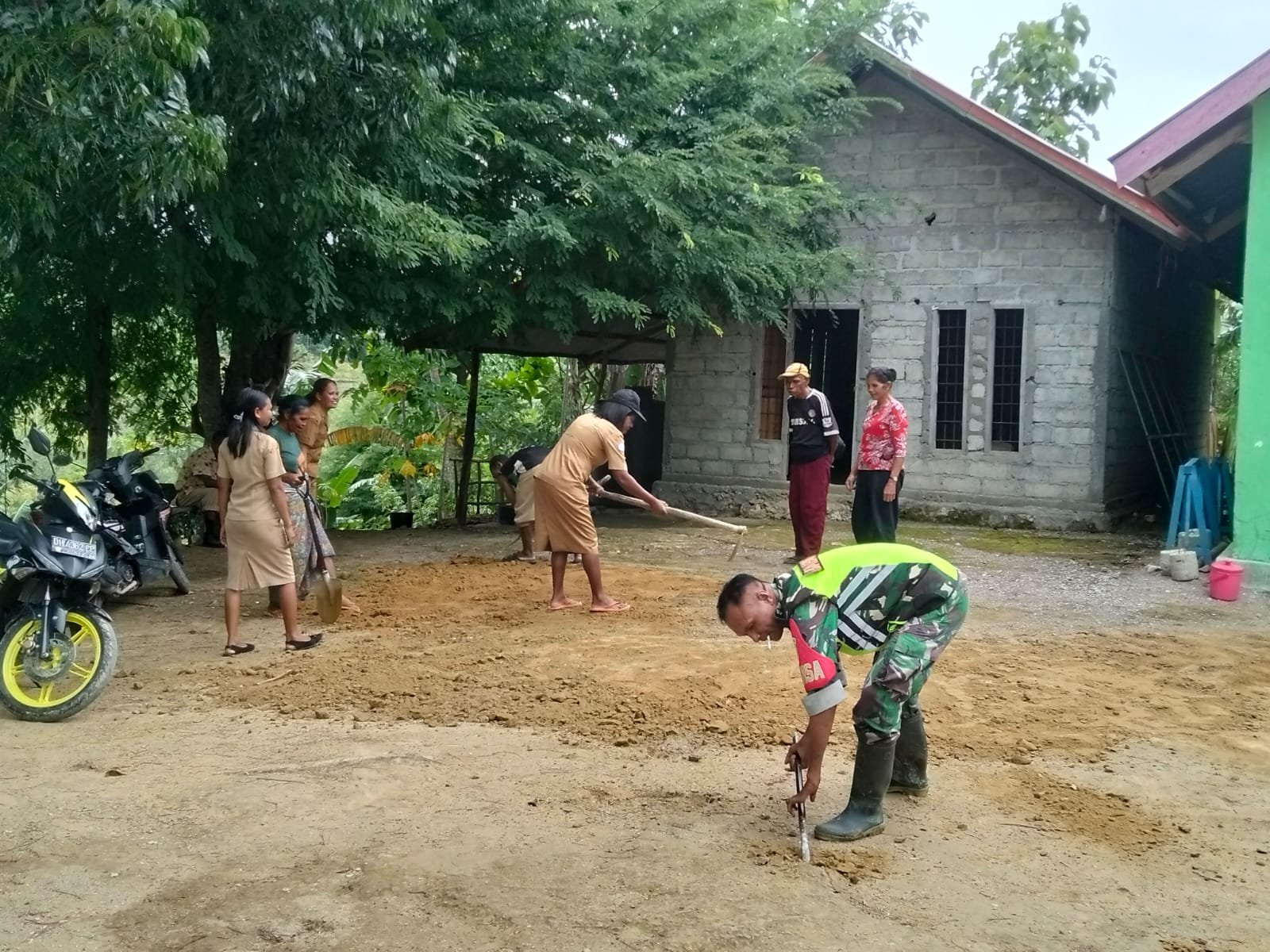 Timor Tengah Selatan – Wujud kepedulian terhadap pembangunan wilayah binaan kembali ditunjukkan Babinsa Koramil 1621-01/Kota Soe, Serda Nyongsri Faot dengan terjun langsung membantu masyarakat meratakan halaman Kantor Desa Enoneontes, Kecamatan Kuatnana, Selasa (10/02/2026).
