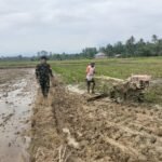 Babinsa Koramil 05/Waingapu Kodim 1601/Sumba Timur Koptu Mukmin Matoke melaksanakan pendampingan pengolahan lahan sawah yang akan di tanami padi dengan menggunakan alat bajak modern hand traktor dilahan milik petani di Kelurahan Mauliru, Kecamatan Kambera, Kabupaten Sumba Timur, Jumat (14/02/2025).