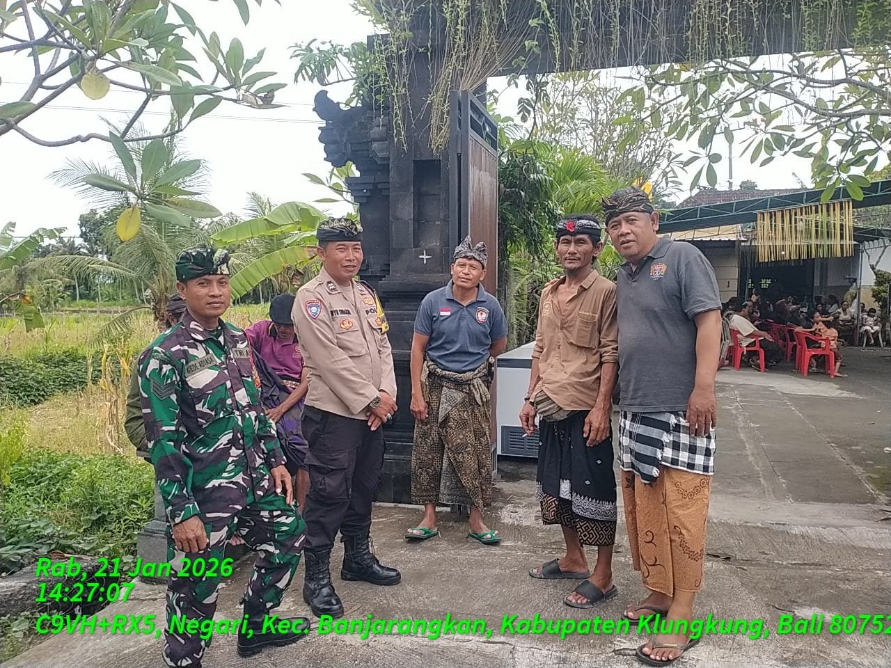 Klungkung,- Sinergi dan dedikasi terbaik untuk menghadirkan keamanan dan kelancaran kegiatan upacara keagamaan, Babinsa Negari Koramil 1610-02/Banjarangkan Serka Gede Adiasa menggelar pengawalan dan pengamanan, bersama Bhabinkamtibmas dan pecalang, Rabu ( 21/01/26 ).
