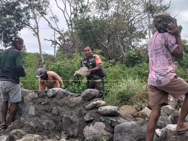 SUMBA BARAT – Babinsa Koramil 02/Walakaka Kodim 1613/Sumba Barat, Serka Ramli, turut membantu pengerjaan pondasi pembangunan Dapur Makan Bergizi Gratis (MBG) di Desa Sodana, Kecamatan Lamboya, Kabupaten Sumba Barat, Kamis (14/01/2026).