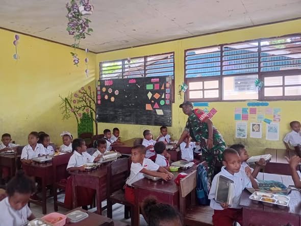 Yapen – Dalam rangka mendukung kelancaran program Makan Bergizi Gratis (MBG), Babinsa Koramil 1709-01/Serui, Serka Tahir Karubaba melaksanakan monitoring dan pendampingan kegiatan MBG di sejumlah sekolah di Distrik Angkaisera, Kabupaten Kepulauan Yapen.Senin(08/02/2026).