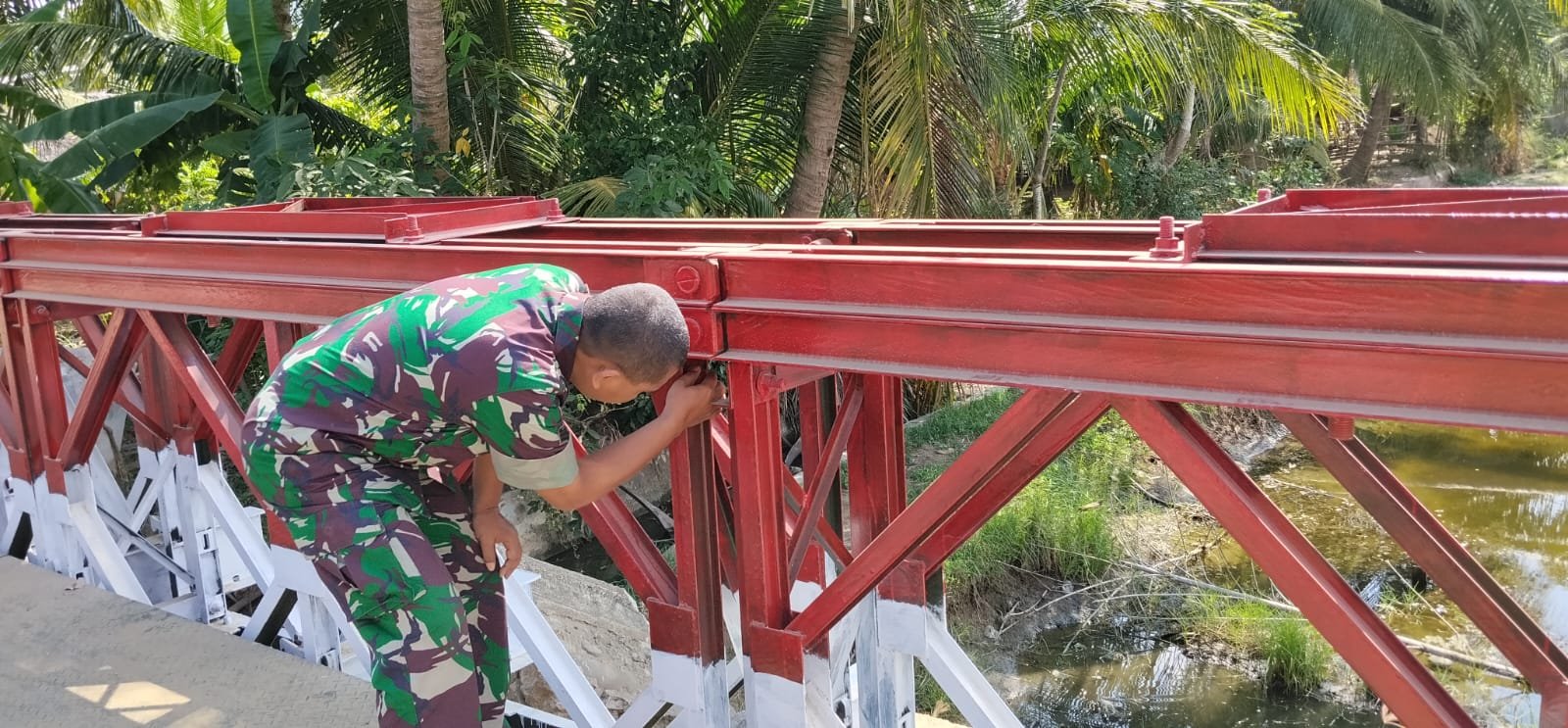 Dalam patroli tersebut, Babinsa turun langsung memeriksa bagian utama jembatan, mulai dari rangka, sambungan, hingga badan jembatan. Pemeriksaan dilakukan secara teliti guna memastikan tidak ada potensi kerusakan yang dapat membahayakan pengguna.