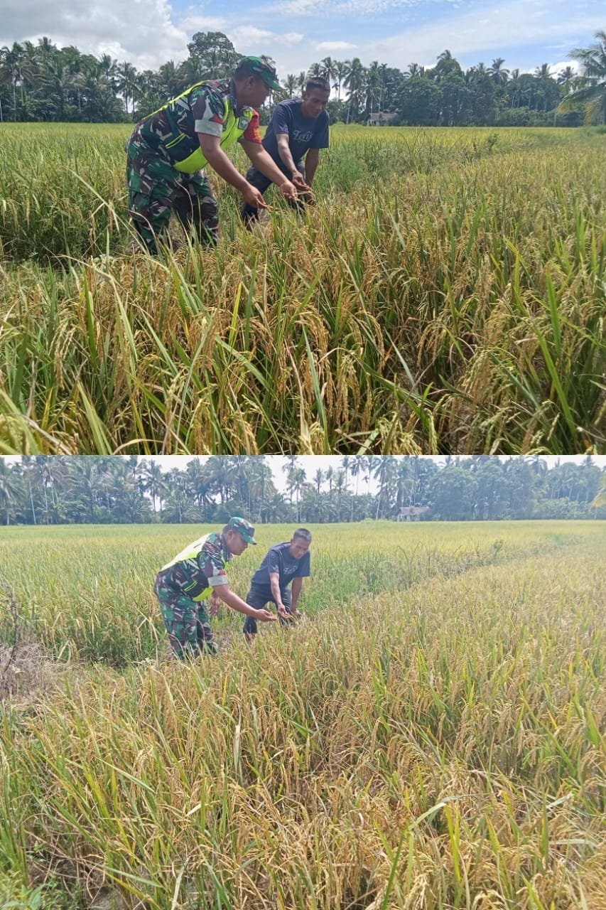 ACEH BARAT – Babinsa Koramil 0105-10/Woyla Barat Kodim 0105/Aceh Barat terus menunjukkan kepeduliannya terhadap ketahanan pangan di wilayah binaan. Salah satunya dengan turun langsung ke sawah milik warga untuk memantau perkembangan tanaman padi yang mulai menguning.