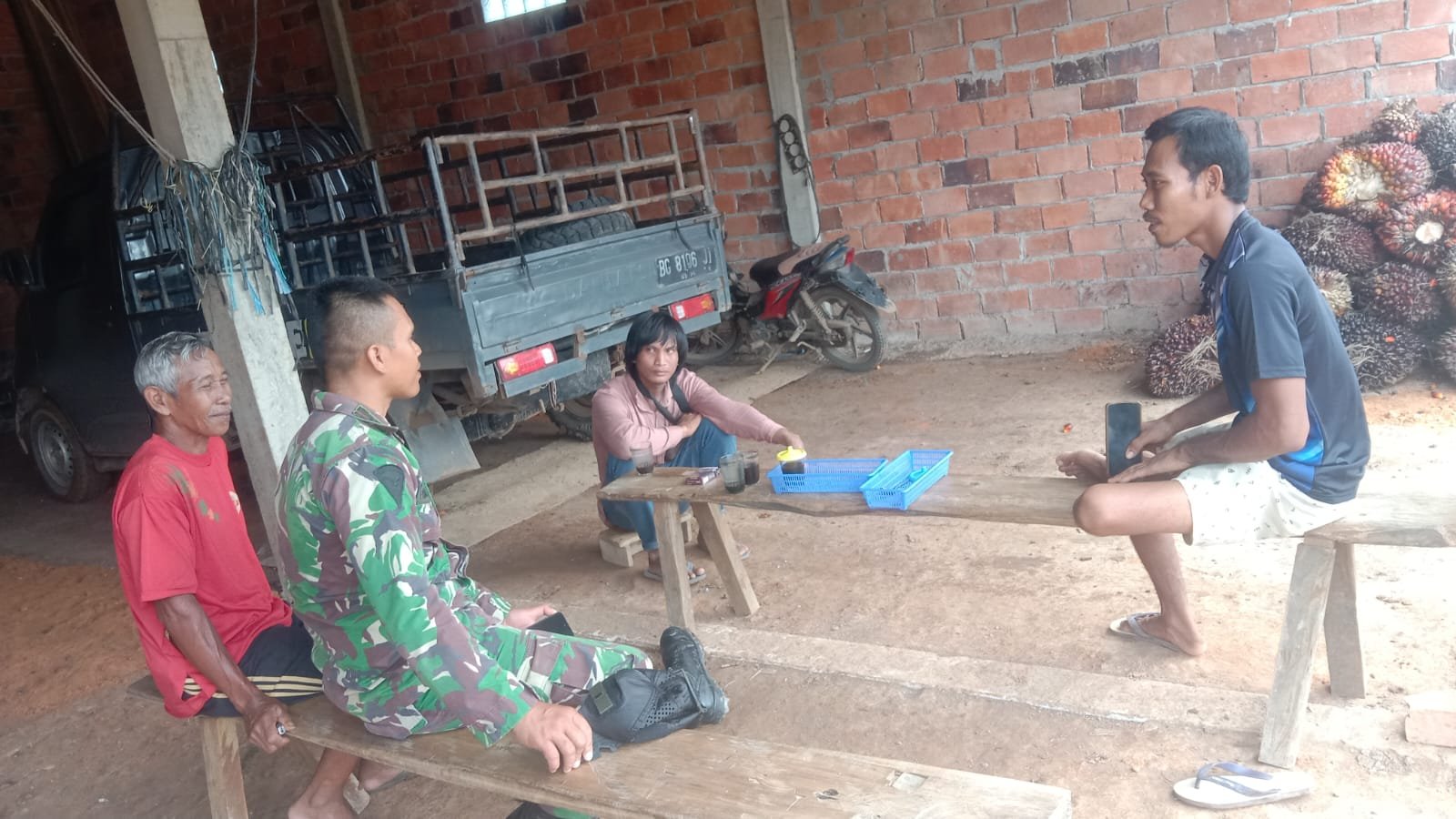 Banyuasin – Kesibukan pekerjaan fisik tidak menghalangi Satgas TMMD ke-127 Kodim 0430/BA untuk terus menjalin kedekatan dengan masyarakat. Hal tersebut terlihat saat anggota Satgas melaksanakan komsos bersama tokoh masyarakat Desa Wonosari, Bapak Marjuki.