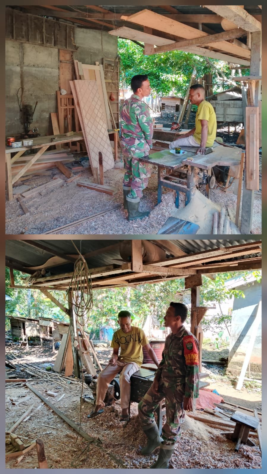 Pada kesempatan hari ini, Serda Didi Suhairi, Babinsa Koramil 02/Woyla, melaksanakan Komsos bersama tukang kayu yang sedang menggarap kusen pintu dan jendela rumah. Dalam kegiatan tersebut, Babinsa memberikan motivasi, dorongan, dan ide-ide yang mungkin bermanfaat guna berkembangnya usaha yang ditekuni olehnya,” tegas Serda Didi Suhairi.
