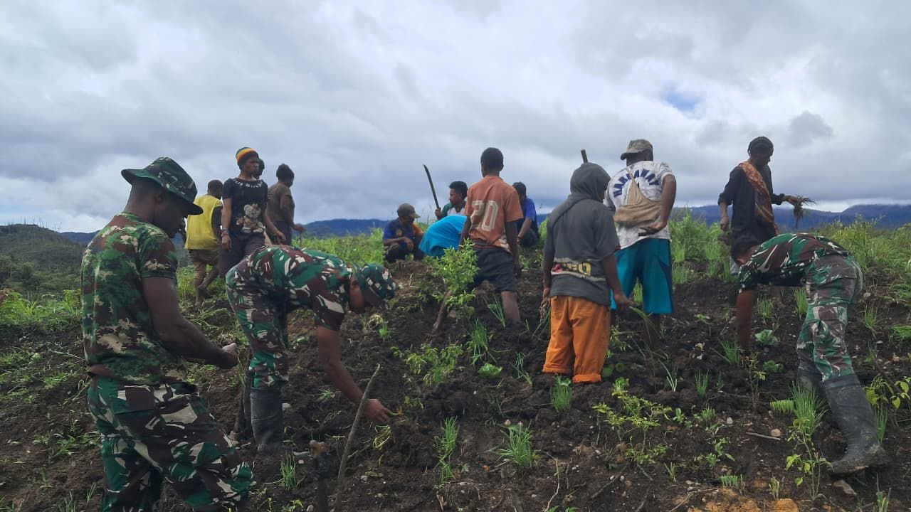 Parim, Pegunungan Bintang — Pos Parim Yonif 751/Vira Jaya Sakti (VJS) Satgas Swasembada bersama masyarakat melaksanakan kegiatan bercocok tanam sebagai upaya menumbuhkan ketahanan pangan sekaligus mendorong kemandirian ekonomi warga. Kegiatan ini bertujuan mengajarkan pemanfaatan lahan agar hasil panen dapat memenuhi kebutuhan keluarga dan berpotensi dijual sebagai tambahan penghasilan. (Senin,2/3/2026).