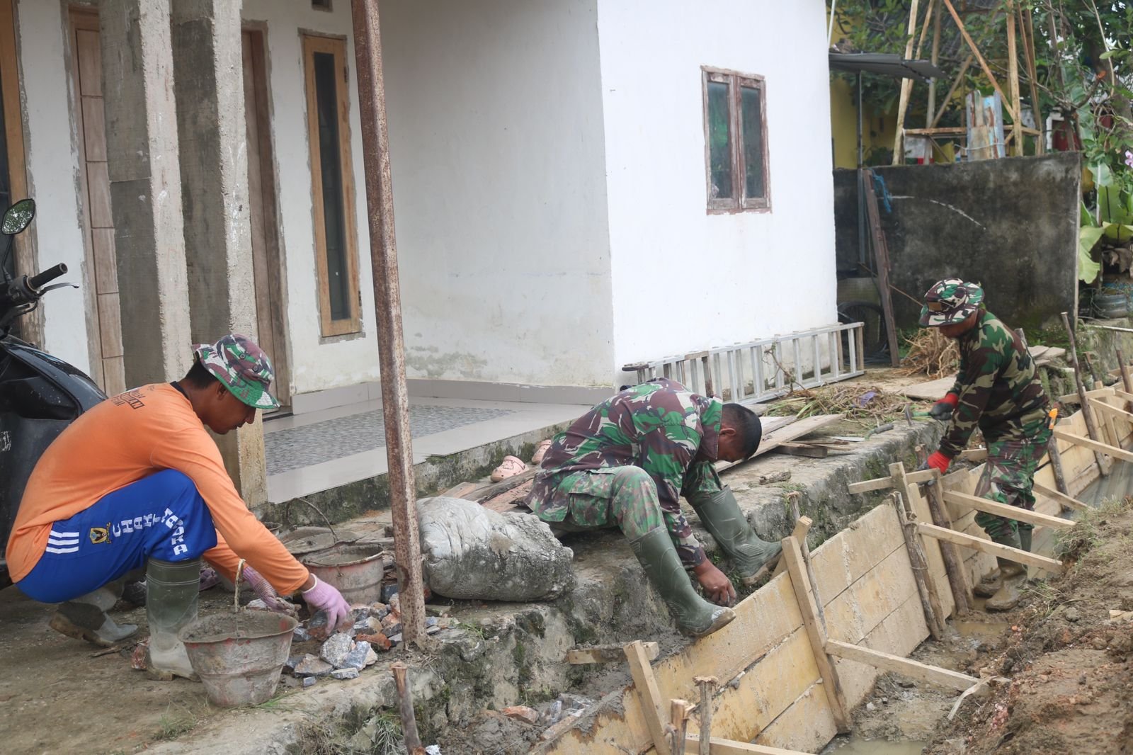 Personel Satgas TMMD bersama warga setempat terlihat bekerja sama dalam proses pengerjaan drainase. Kolaborasi tersebut mempercepat proses pembangunan sekaligus memperkuat semangat gotong royong di tengah masyarakat.